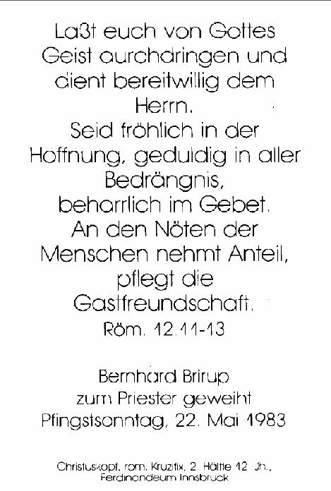 Brirup, Bernhard geb. 12.02.1953 in Münster 1983 Aushilfe im Pfarrverband Vreden 1983 Kaplan in Warendorf (Freckenhorst) St. Bonifatius 1987 Kaplan in Oelde St. Joseph 1991 Pfarrer in Recklinghausen (Suderwich) St. Johannes und Recklinghausen (Essel) Hl. Geist 1995 zusätzl. Pfarrer in Recklinghausen (Suderwich) St. Barbara 1995 Leiter des Pfarrverbandes Recklinghausen-Ost 2004 Pfarrer in Recklinghausen (Suderwich) St. Johannes 2006 Pfarrer in Rheine St. Mariä Himmelfahrt 2014 Nach Fusion der Pfarreien rechts der Ems Pastor m.d.Titel Pfarrer in St. Antonius, Rheine |