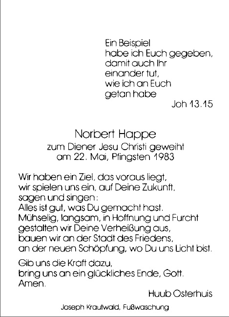 Happe, Norbert geb. 31.03.1954 in Ahlen 1983 Aushilfe in Brake St. Marien und Ahaus St. Joseph 1983 Kaplan in Marl (Drewer)St. Josef 1987 Kaplan in Duisburg (Rheinhausen) St. Peter 1989 freigestellt für den Seelsorgedienst in Cardonal, Bistum Tula/Mexico 1990 Pfarrer in Durango San Franzisco de Asis., Zimapan, Hgo./Mexico 1996 Pfarrer zur Aushilfe in Steinfurt (Borghorst) St. Nikomedes 1996 Pfarrer zur Aushilfe in Dülmen Maria Königin 1997 Pfarrer in Sassenberg St. Johannes Ev. 2005 Vicarius Cooperator m.d.T. Pfarrer in St. Paul, St. Franziskus v. Assisi und St. Suitbert in der Seelsorgeeinheit Recklinghausen, Recklinghausen (Hochlar) und Recklinghausen (Stuckenbusch) 2005 Pfarrverwalter in Recklinghausen St. Katharina von Siena 2006 verschiedene Aushilfen im Bistum 2006 Pfarrer zur Aushilfe in Hamminkeln (Dingden) St. Pankratius 2007 Vicarius Cooperator m.d.T. Pfarrer in Lünen St. Marien 2008 Pfarrverwalter m.d.T. Pfarrer in Herten St. Mariä Heimsuchung 2009 Definitor im Dekanat Herten 2009 Pfarrer in Herten St. Mariä Heimsuchung 2012 Pfarrer in Beelen St. Johannes Baptist 2021 Pfarrer em., wohnhaft in in Hoetmar St. Lambertus |