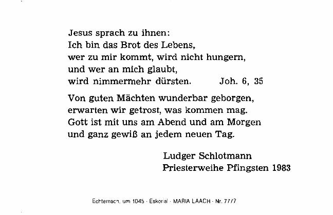 Schlotmann, Ludger geb. 29.07.1955 in Ennigerloh (Enniger) 1983 Aushilfe in Westerstede Herz Jesu, Rosendahl (Holtwick) St. Nikolaus und Hopsten (Halverde) St. Peter und Paul 1983 Kaplan in Rheine (Mesum) St. Johannes Bapt. 1987 Vikar in Dinklage St. Katharina 1991 Pfarrer in Velen (Ramsdorf) St. Walburga 1992 Leiter des Pfarrverbandes Gescher-Ramsdorf-Velen 1994 Definitor im Dekanat Borken 2000 erneut Definitor im Dekanat Borken 2001 Pfarrer in Oelde St. Joseph 2002 Pfarrer in St. Joseph und Vicarius Cooperator an St. Johannes, St. Lambertus, St. Vitus (Lette) und St. Vitus (Sünninghausen) in der Seelsorgeeinheit Oelde, Oelde (Lette), Oelde (Stromberg) und Oelde (Sünninghausen) 2003 zusätzl. Pfarrverwalter in St. Vitus (Lette) in derselben Seelsorgeeinheit 2010 Pfarrer in Ahlen (Vorhelm) St. Pankratius 2015 Seelsorger m.d.T. Pfarrer in Beckum, St. Stephanus 2024 Am 5. April stirbt Ludger Schlotmann nach kurzer, schwerer Krankheit. 2024 Am 12. April wird in St. Stephanus, Beckum, für ihn das Requiem gefeiert, einige Tage wir er beigesetzt.RIP |